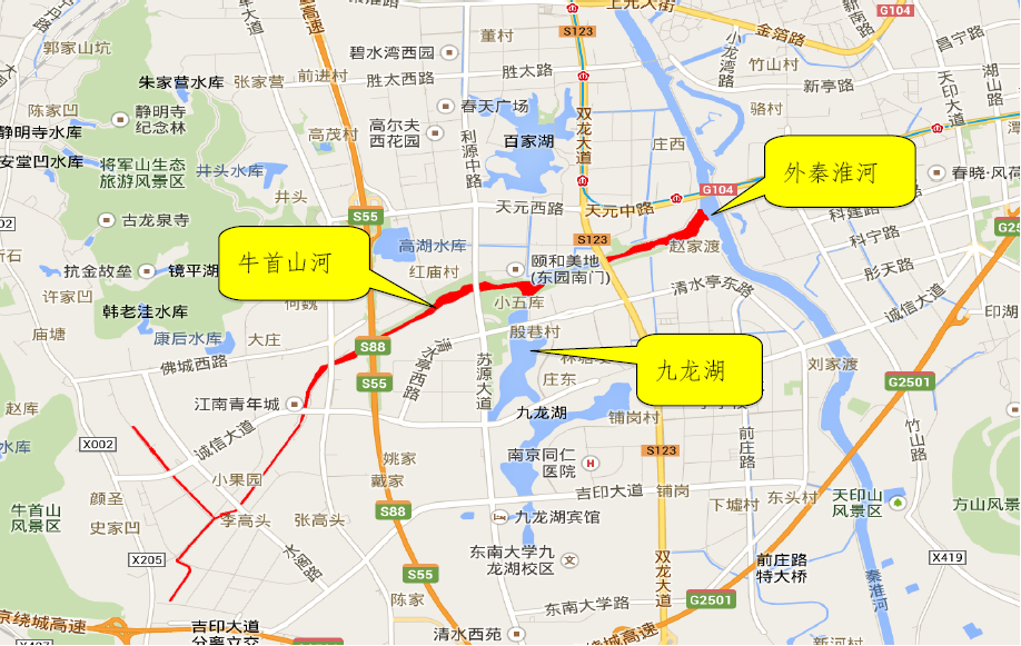 牛首山河總長(zhǎng)約8公里,貫穿南京市整個(gè)江寧經(jīng)濟(jì)技術(shù)開發(fā)區(qū)。沿岸有美麗的九龍湖公園和眾多高檔住宅小區(qū),是周邊居民閑暇散步垂釣的好去處。