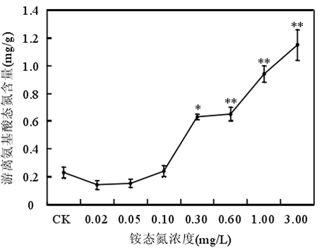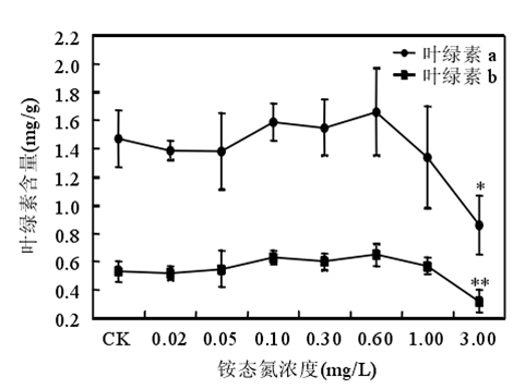 銨態氮濃度低于 0.60mg/時苦草生長良好,濃度大于或等于 1.00mg/L 時苦草的光合能力受到抑制、代謝受到干擾??嗖輰︿@態氮最敏感的生理生化指標是葉片中游離氨基酸態氮含量。銨態氮作為沉水植物的一種營養物質,當其含量較低時,植物由于營養缺乏誘導產生自由基。