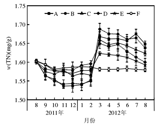 苦草對水體營鹽的去除率隨生物量的增加不斷增大,當生物量達到 2380.00g時,去除率放緩??嗖莞瘮♂尫诺牧状蟛糠直坏啄辔?,少量進入水體。草腐敗分解具有階段性,前36d分解迅速,以后分解速率顯著下降。