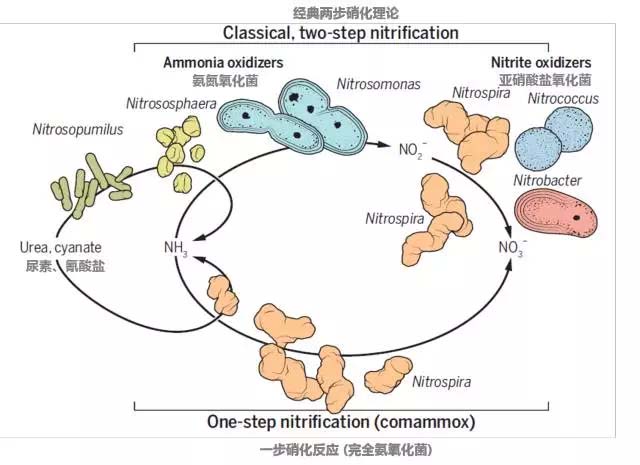 這個(gè)理論最先是由俄國(guó)微生物界傳奇維諾格拉斯基 (Sergei Winogradsky)早在19世紀(jì)末“成功”展示,他分離出了負(fù)責(zé)這兩步硝化的微生物,也就是所謂的AOB(ammonia oxidizing bacteria)和NOB(nitrite oxidizing bacteria)。但這個(gè)超過(guò)100年歷史的教條在2015年圣誕節(jié)前被英國(guó)明星科學(xué)雜志《自然》上的兩篇同日發(fā)表的題目雷同的文章和隨后一篇在美國(guó)微生物學(xué)會(huì)的文章終結(jié)了。三個(gè)科學(xué)團(tuán)隊(duì)發(fā)現(xiàn)了三種不同的培養(yǎng)[1,2]和一種非培養(yǎng)細(xì)菌[3]能夠各自進(jìn)行從氨氮到硝態(tài)氮的完全硝化過(guò)程。